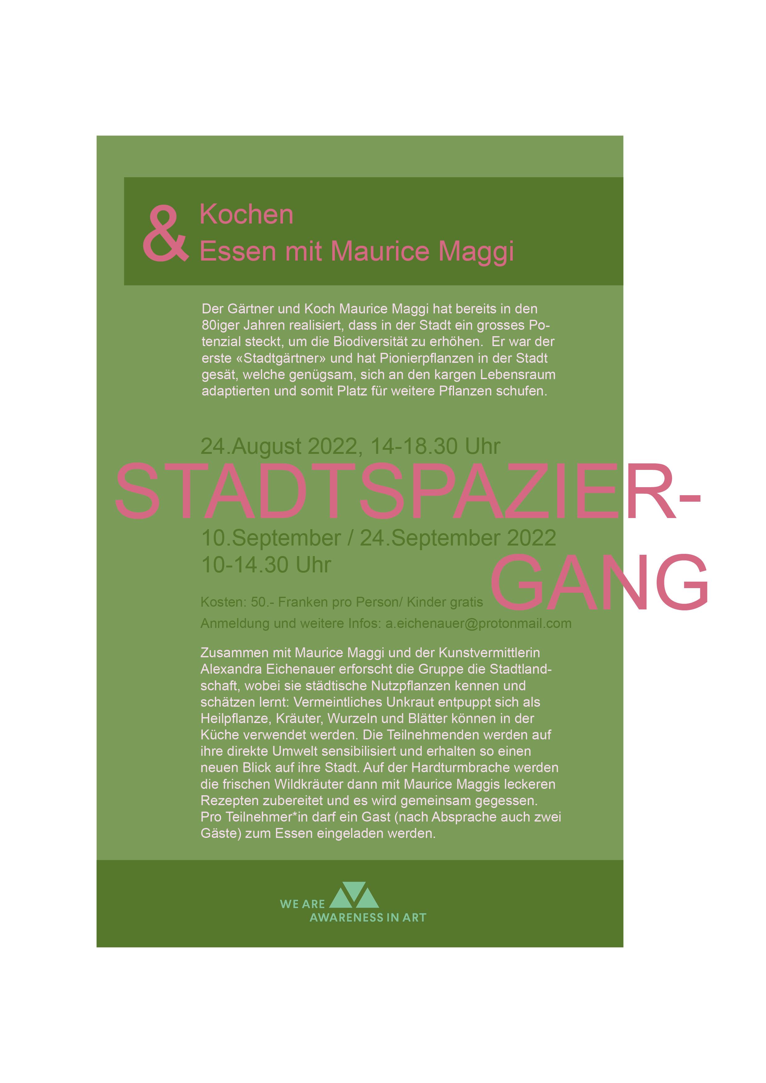 Zusammen mit Maurice Maggi und der Kunstvermittlerin Alexandra Eichenauer erforscht die Gruppe die Stadtlandschaft, wobei sie städtische Nutzpflanzen kennen und schätzen lernt: Vermeintliches Unkraut entpuppt sich als Heilpflanze, Kräuter, Wurzeln und Blätter können in der